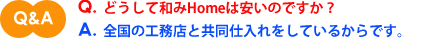 私達「和みHome」は品質の良い住宅をどこよりも安く提供するため全国の優良住宅会社で資材の共同仕入れを行っています。 全国500棟の実績をもとに圧倒的に安い仕入額を実現しています。 また、これに賛同する職人集団がロスのない技術を提供することで、 これまでにない価格設定が可能となりました。 |